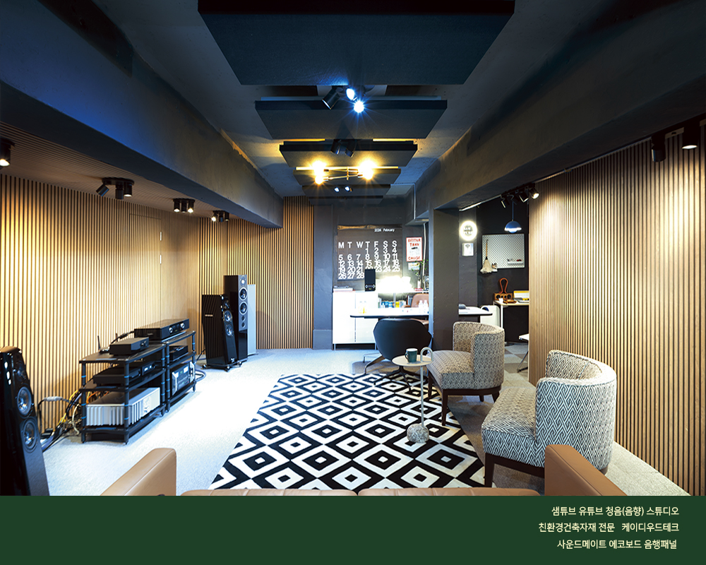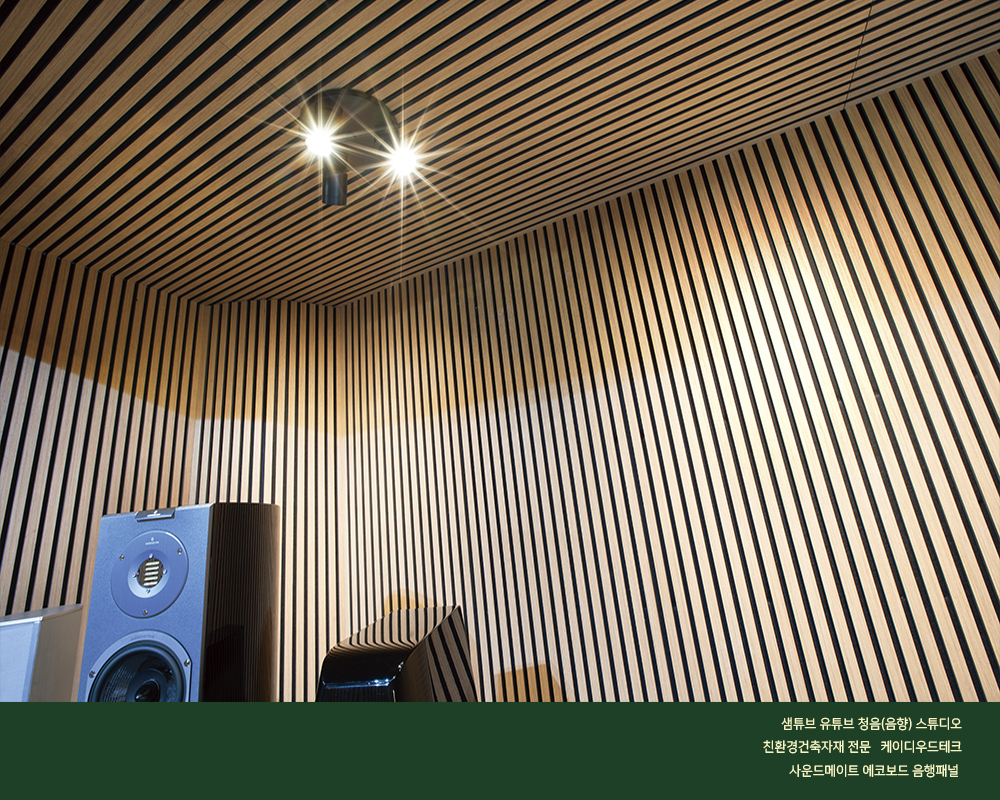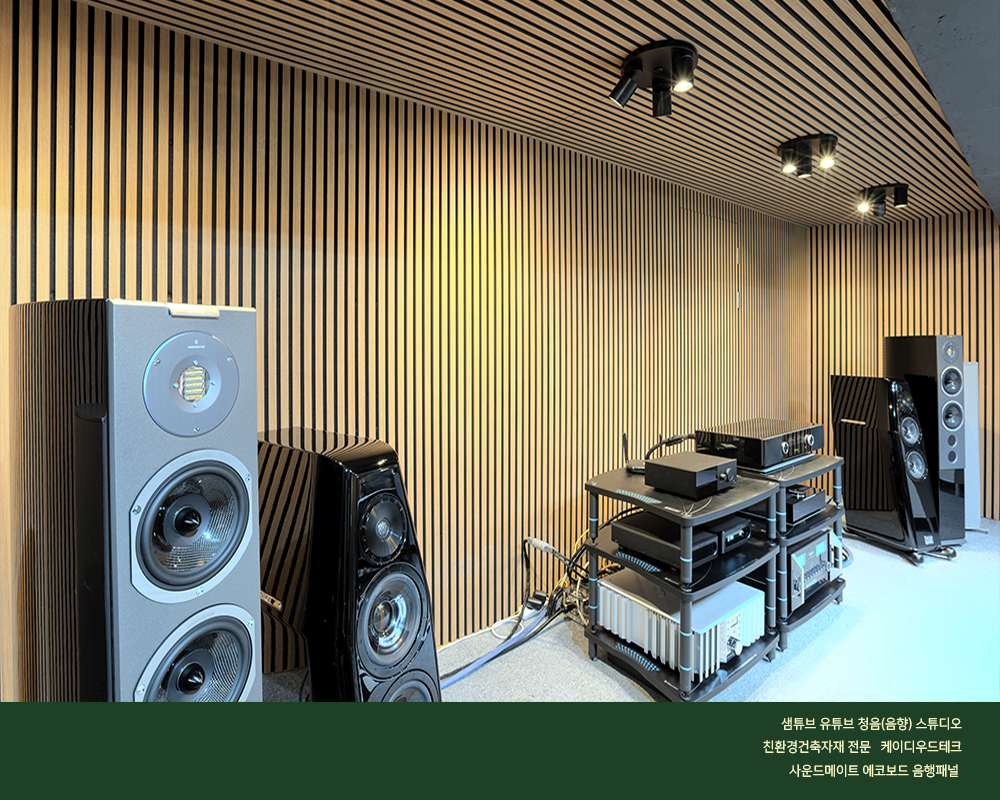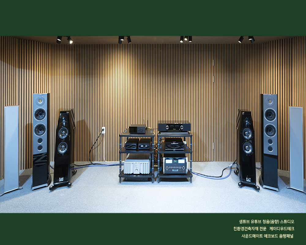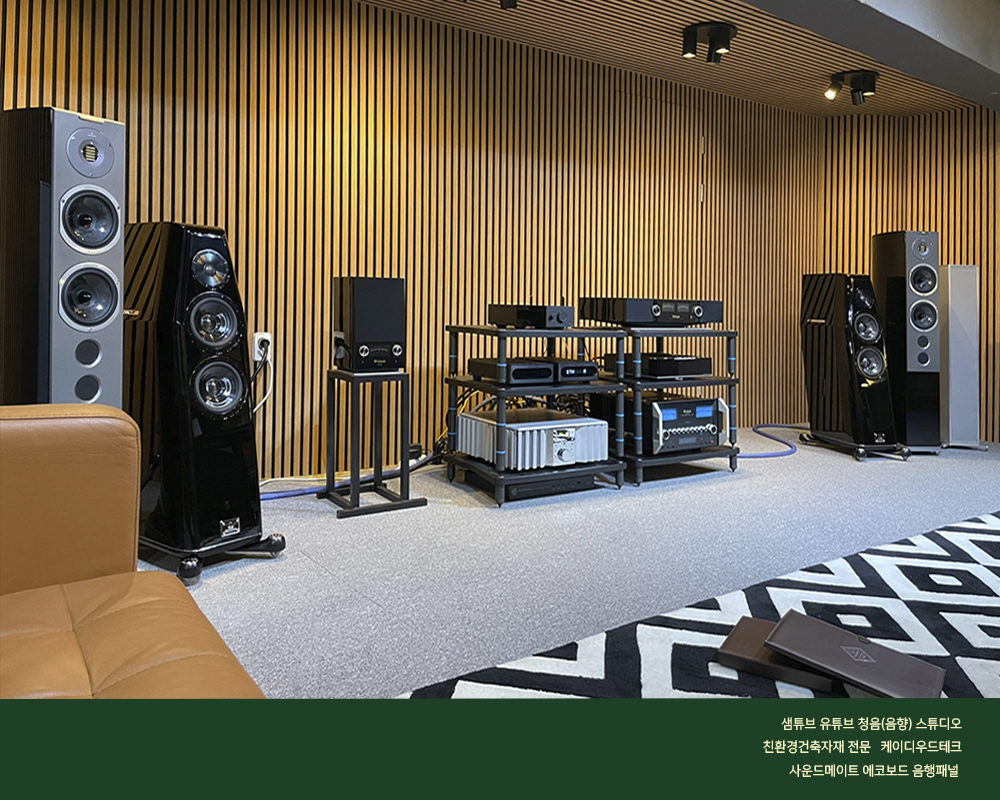 “음악과 오디오를 즐기는 가이드” 샘튜브 유튜브 채널의 음향[청음] 스튜디오에 케이디우드테크 사의 사운드메이트 음향패널이 설치되어 지난 1월부터 운영되고 있습니다. 본 음향[청음] 스튜디오에서 케이디우드테크 사의 제품을 설치하게 된 가장 중요한 이유로서는 “목재를 오래 다루어 온 전문기업으로서의 신뢰감이 가장 크고, 스펙트럼이 매우 넓은 제품군으로 용도가 다양하며, 제품의 시공이 매우 간단하다는 것과, 무엇보다도 시각적으로 뛰어난 인테리어 효과 또한 좋은 포인트가 되었습니다. 처음 시공을 한 이후에 다른성능의 제품들로 업그레이드 할 수 있는 선택의 폭이 넓다는 점 또한 사운드메이트 브랜드에 대한 훌륭한 접근성으로 보였습니다.” 라고 샘튜브 운영자 오 승영 대표는 이야기 하였다. 또한 음향기기 관련 컨텐츠의 모든 것을 담아내고 있는 유튜버 평론가 오 대표는 본인의 음향[청음] 스튜디오에 설치된 사운드메이드 음향 패널로 설치한 어쿠스틱 환경에 대해 다음과 같이 평가하였다.