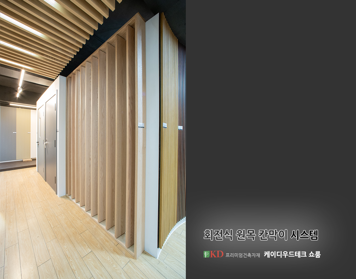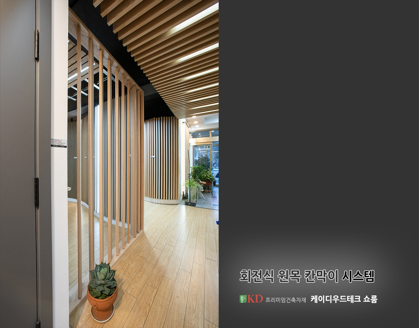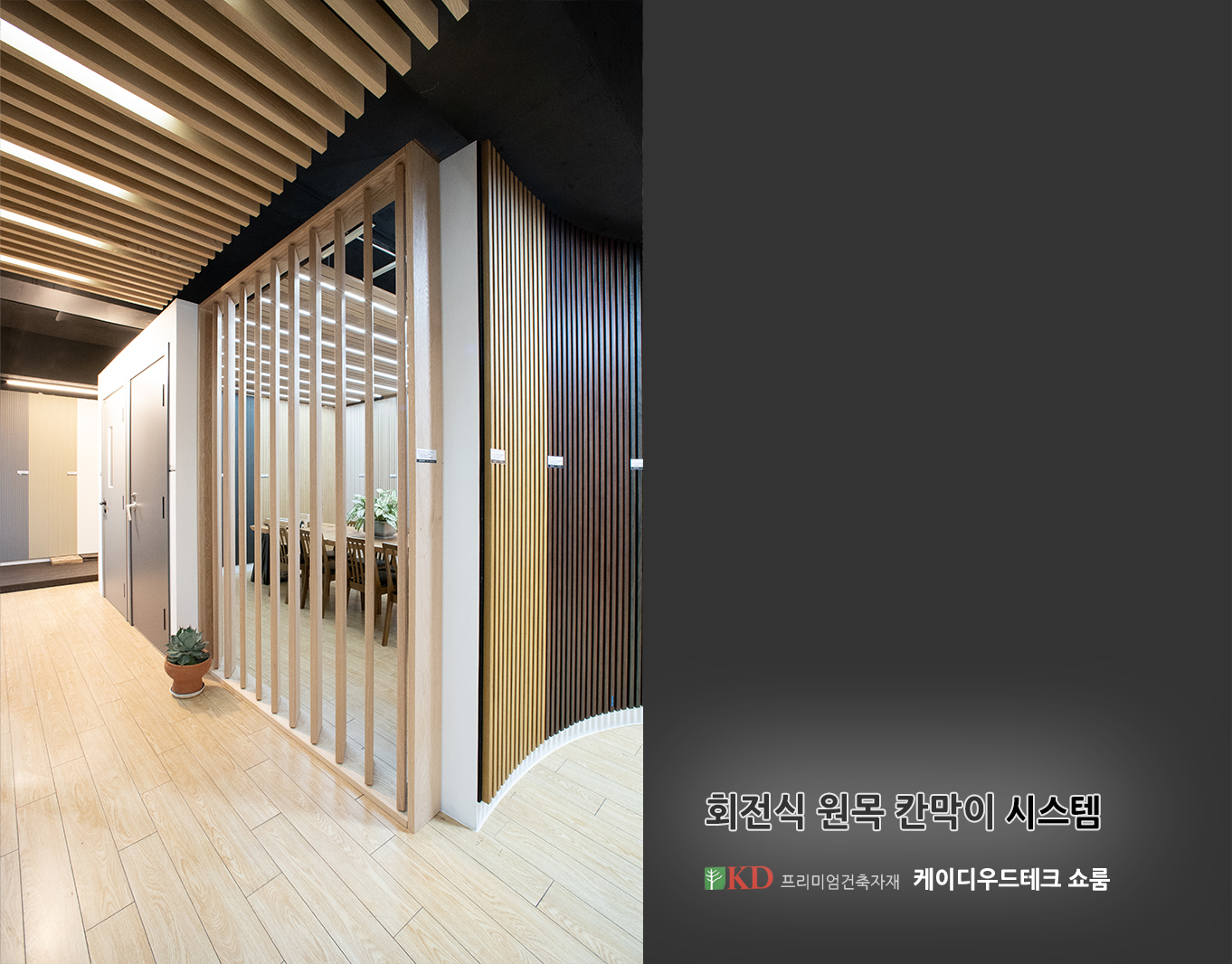 •공간을 분리하는데 있어서 KD가 공급하는 회전식 원목루버 칸막이 시스템은 가장 간편하게 설치가 가능한 시스템입니다.