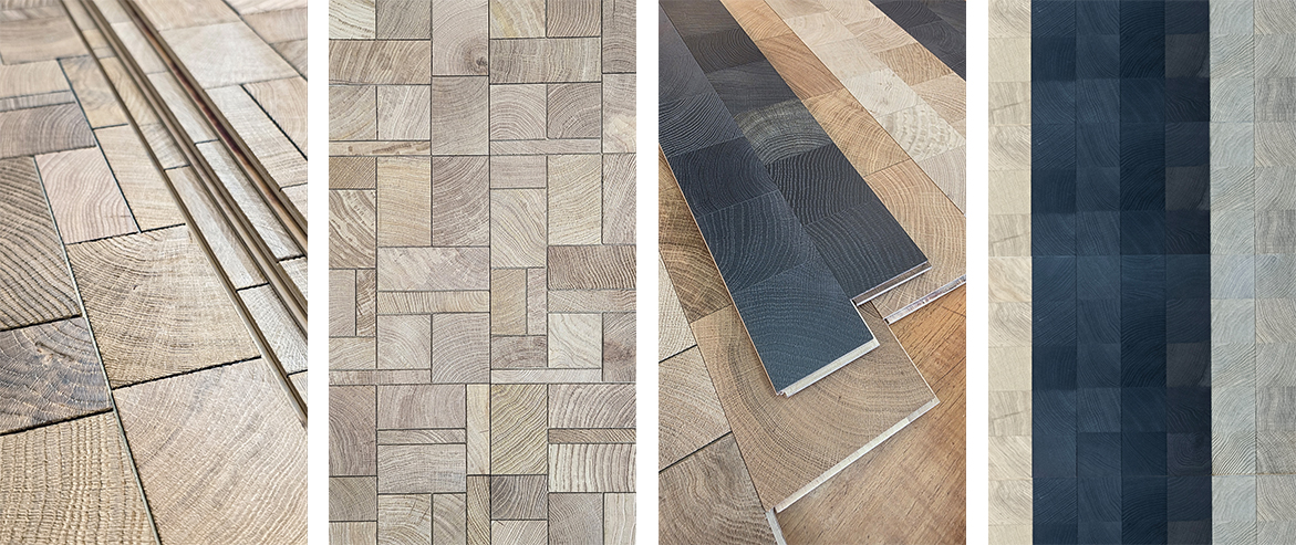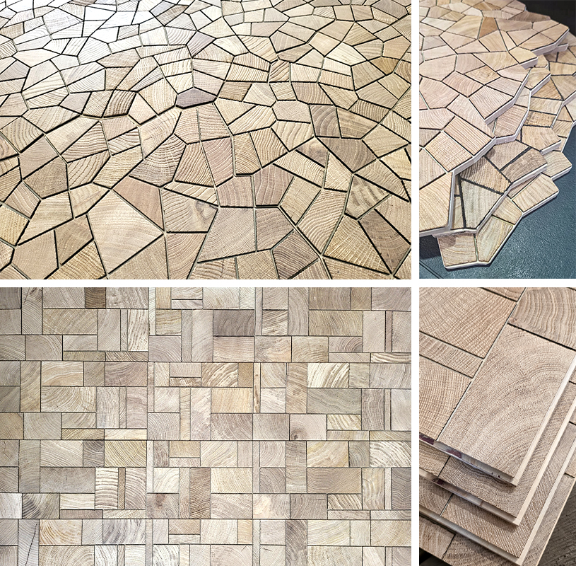 KD 엔드그레인 오크 플로어링의 특징 소재: 유럽산 화이트오크 컬러: 내추럴 / 퓨머드 / 블랙 / 그레이 디자인: Square / Eclats / Leaf / Mix / Vintage Crack 등 8종 이상 마감방식: Lacquered / Oiled / Brushed / Sanded 등 규격: 15~20mm 두께, 다양한 모듈 사이즈 선택 가능