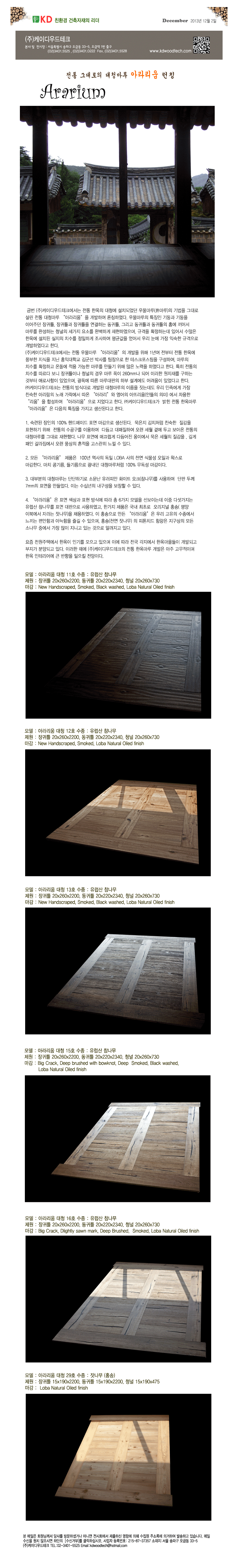 (주)케이디우드테크에서는 전통 한옥의 대청에 설치되었던 우물마루(井마루)의 기법을 그대로 살린 전통 대청마루 “아라리움”을 개발하여 론칭하였다. 우물마루의 특징인 기둥과 기둥을 이어주던 장귀틀, 장귀틀과 장귀틀을 연결하는 동귀틀, 그리고 동귀틀과 동귀틀의 홈에 끼어서 마루를 완성하는 청널의 세가지 요소를 완벽하게 재현하였으며, 규격을 확정하는데 있어서 수많은 한옥에 설치된 실지의 치수를 정밀하게 조사하여 평균값을 얻어서 우리 눈에 가장 익숙한 규격으로 개발하였다.
