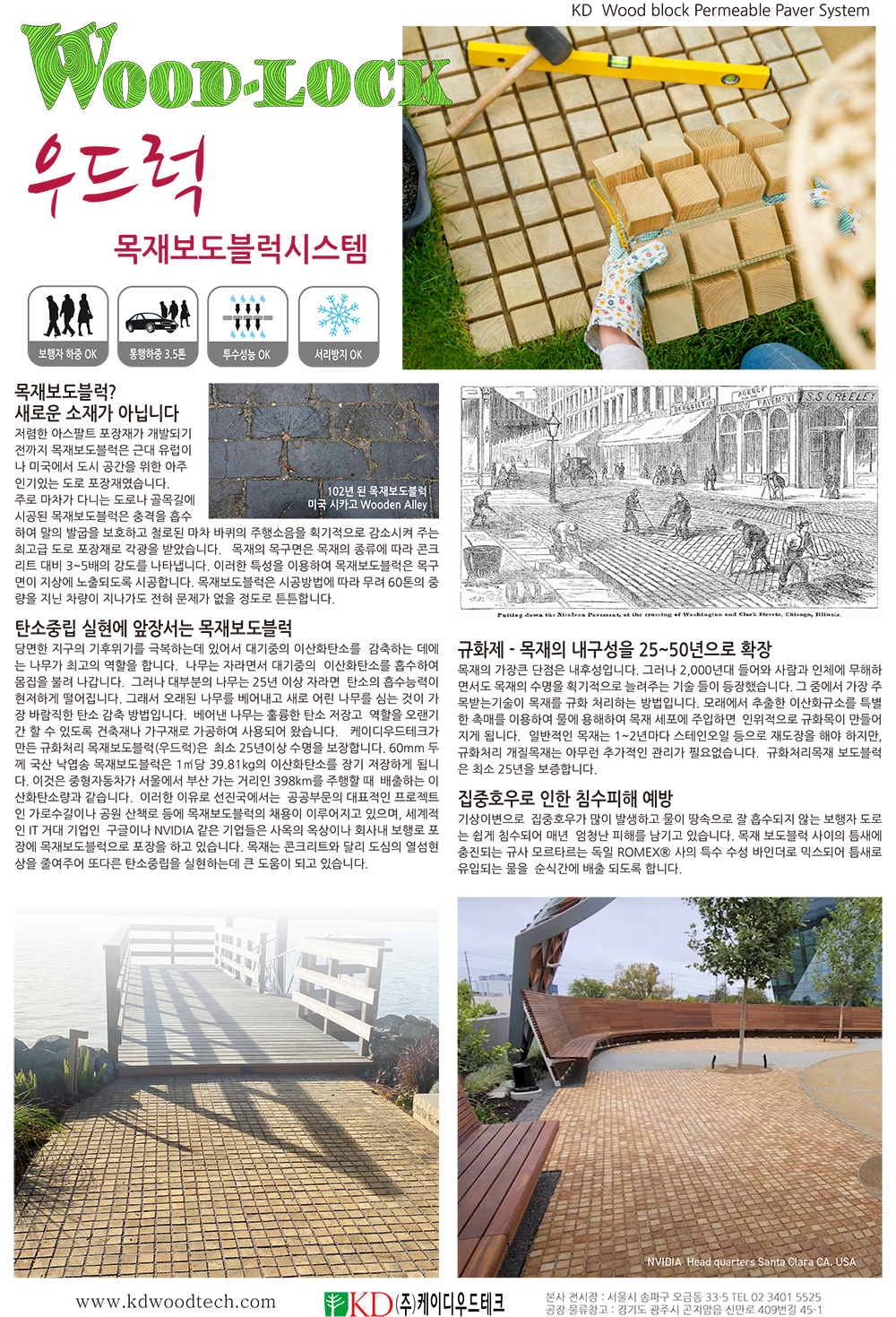 60mm 두께 국산 낙엽송 목재보도블럭은 1㎡당 39.81kg의 이산화탄소를 장기 저장하게 됩니다. 이것은 중형자동차가 서울에서 부산 가는 거리인 398km를 주행할 때 배출하는 이산화탄소량과 같습니다. 이러한 이유로 선진국에서는 공공부문의 대표적인 프로젝트인 가로수길이나 공원 산책로 등에 목재보도블럭을 사용하고 있습니다. 세계적인 IT 거대 기업인 구글이나 NVIDIA 같은 기업들은 사옥의 옥상이나 회사내 보행로 포장에 목재보도블럭으로 포장을 하고 있습니다. 목재는 콘크리트와 달리 도심의 열섬현상을 줄여주어 또다른 탄소중립을 실현하는데 큰 도움이 되고 있습니다.