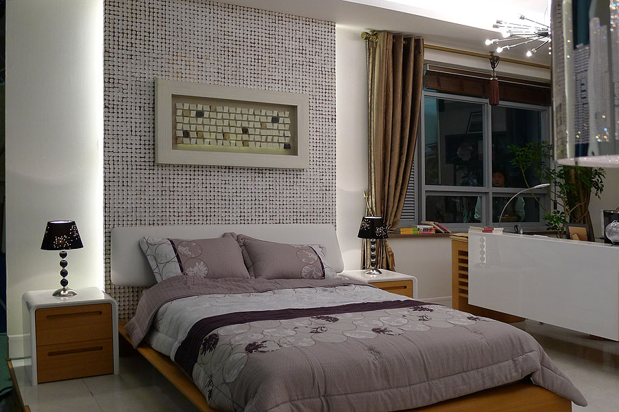 침실의 해드보드 면을 편안하게 마감한 디자인을 보여준다.
